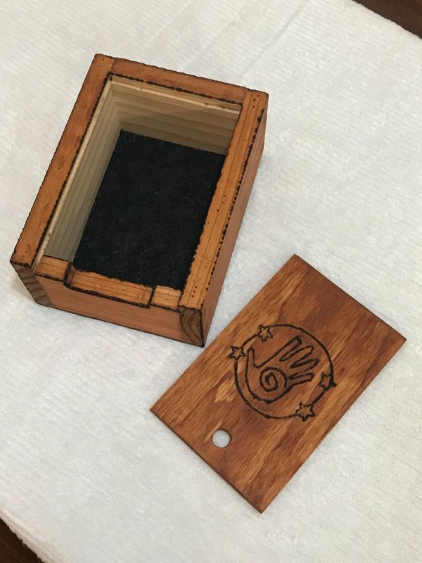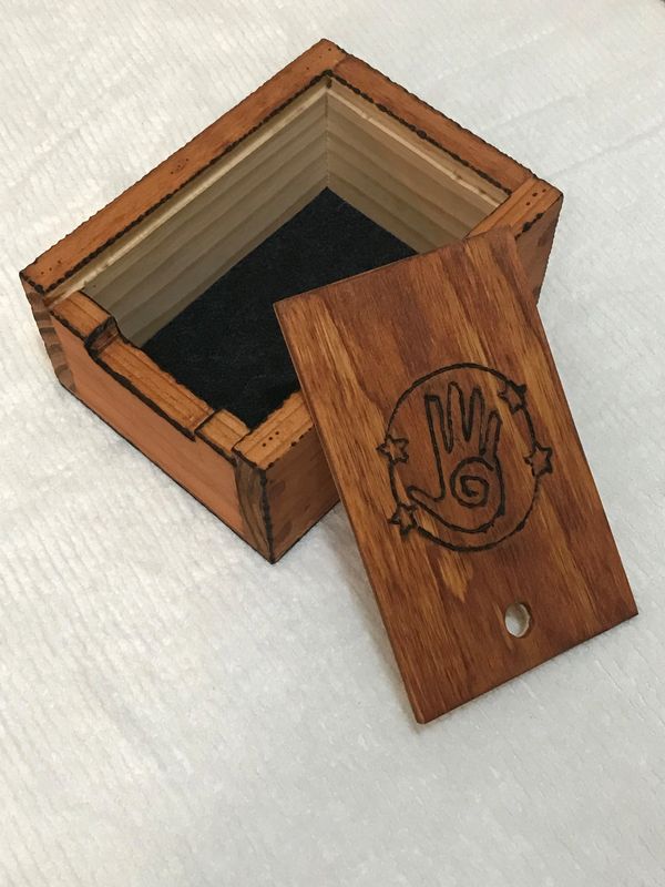 For your oracle card box, you choose your own personal design to be etched on the lid and you choose from a range of different coloured felts to line the bottom.