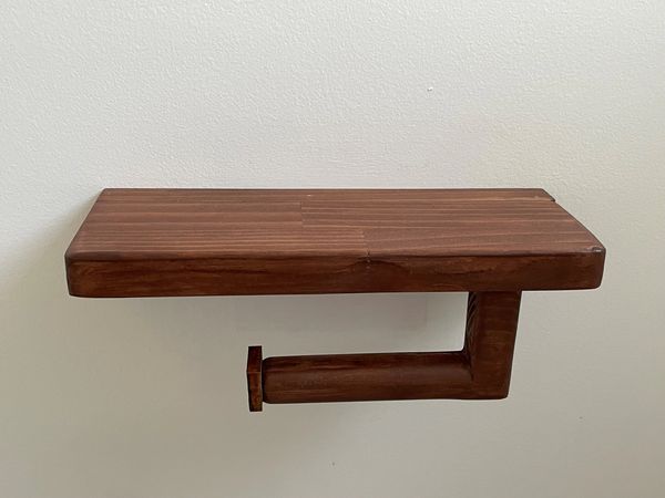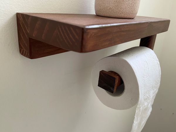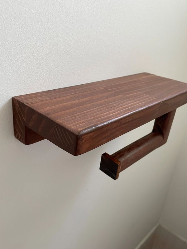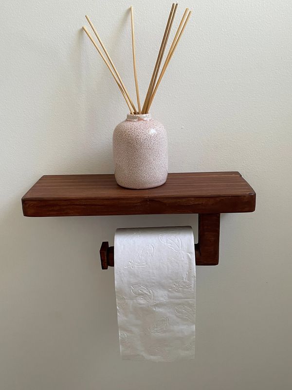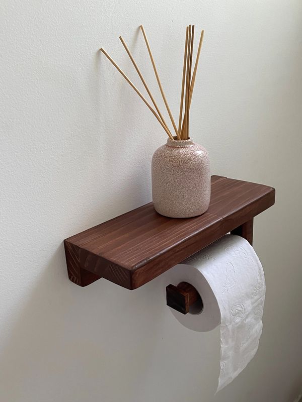 The toilet roll holder is handcrafted from natural pine and oil stained.